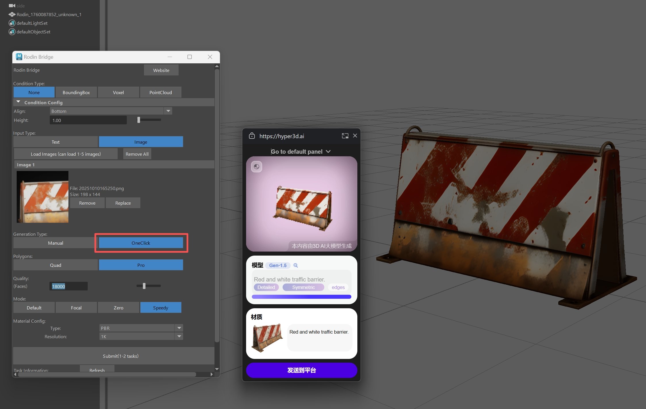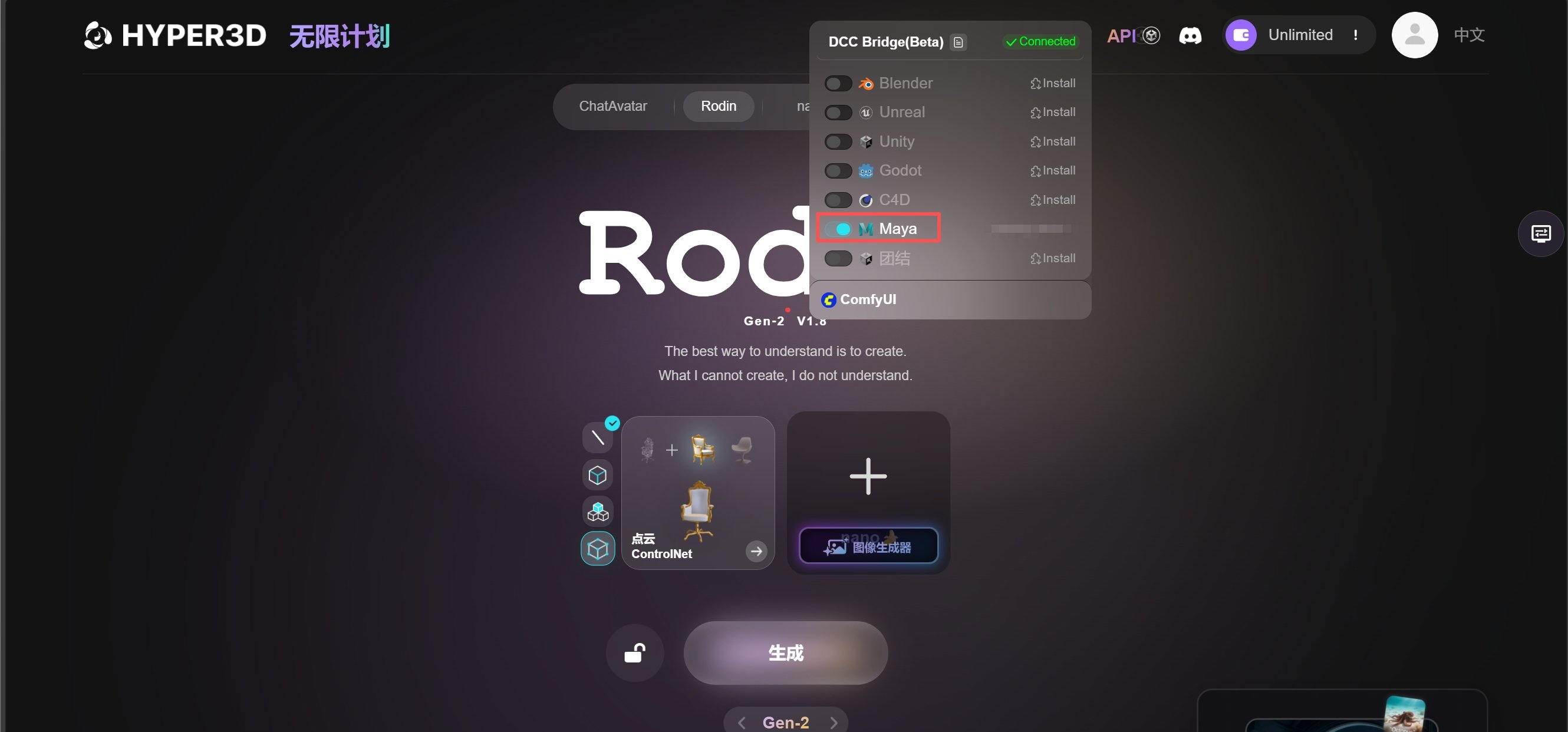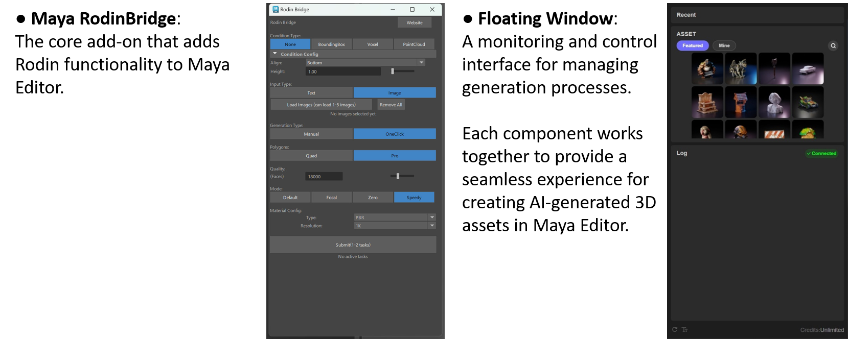 The Rodin add-on for Maya is a powerful integration tool that supports most of the functions available on Rodin's webpage, allowing users to access image-based generation capabilities directly within the Maya environment. It enables users to replace target images, adjust generation settings, utilize ControlNet with selected objects, and choose between automatic and manual generation modes—all while maintaining a seamless workflow between Maya and the Rodin web interface through the convenient floating window functionality.
