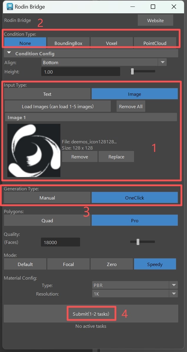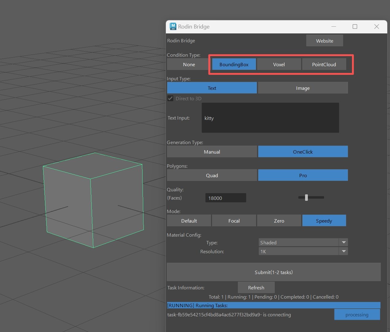 The Rodin add-on integrates most Rodin's generation functions directly in Maya. Operation requires interaction in both Maya and the Rodin webpage.