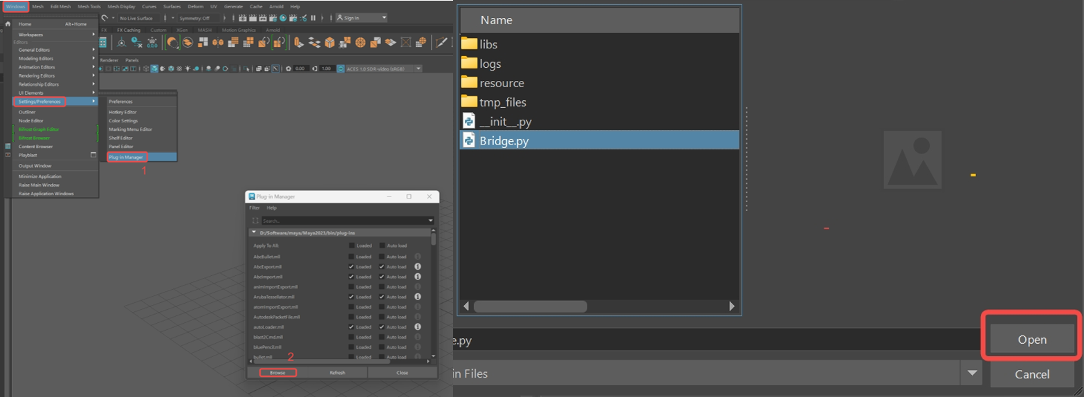- Click Browse at the bottom of the Plug-in Manager window, locate the 'RodinBridge_Maya' folder and select the 'Bridge.py' file and Open.