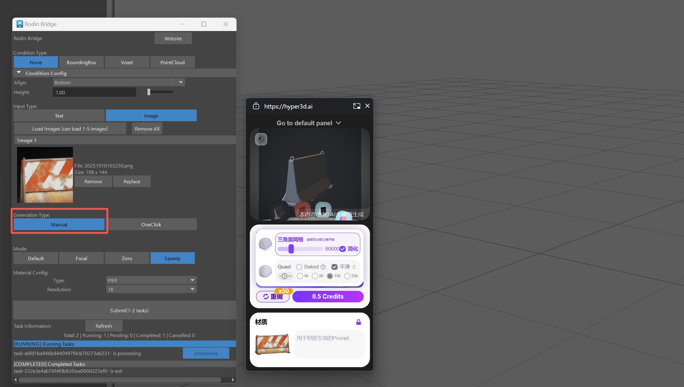 Manual: Requires step-by-step operation in the floating window. The process is identical to that on Rodin webpage.